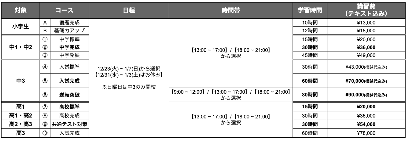【冬期講習コース・時間帯】